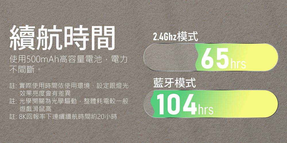 | 回報率 | 125/250/500/1000Hz (有線&2.4GHz 支援8000Hz) |