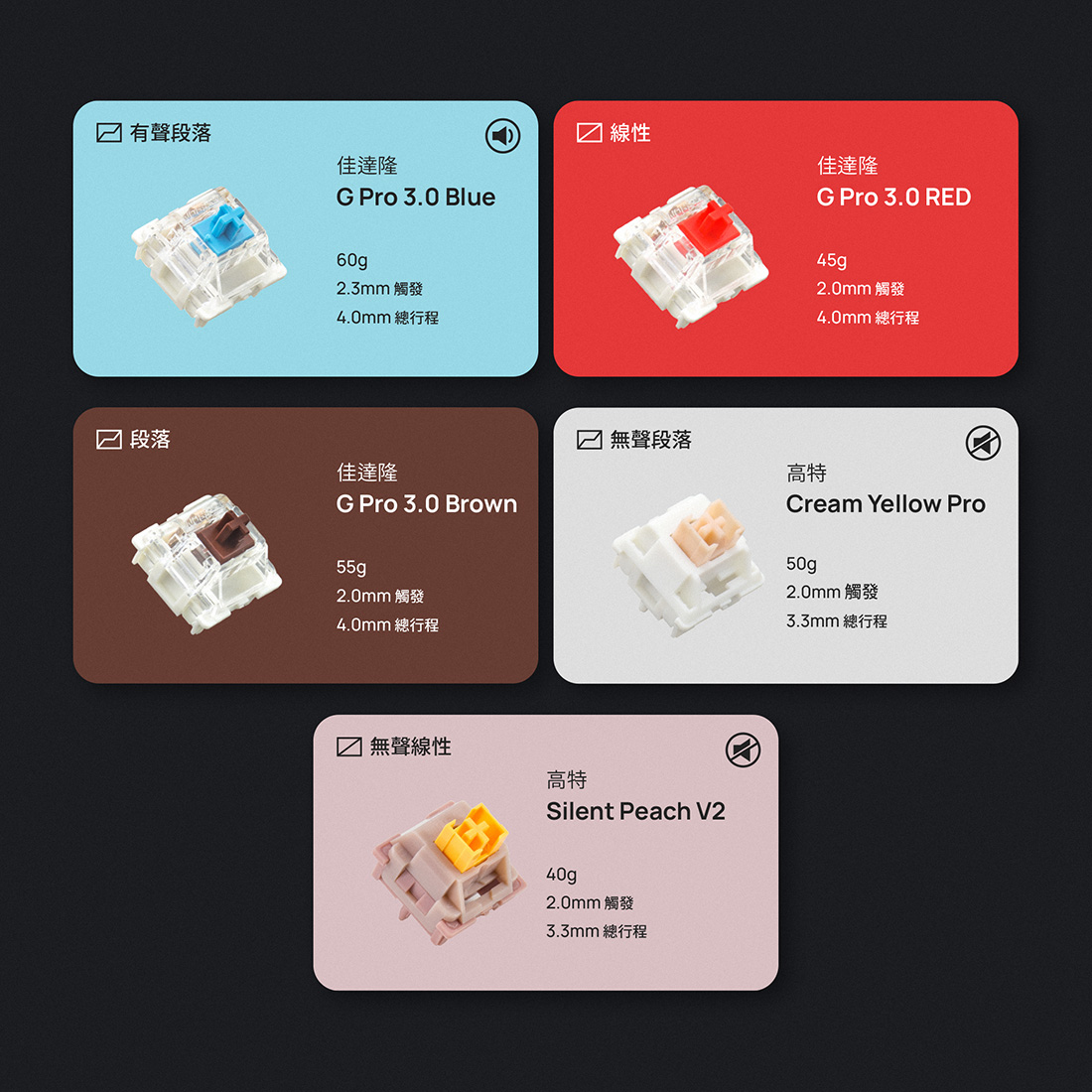 | 軸體 | 佳達隆G Pro3.0 Blue / 佳達隆G Pro3.0 RED / 佳達隆G Pro3.0 Brown / 高特Cream Yellow Pro |